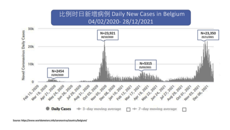 自2020年2月至2021年12月28日,比利时已经历了4次疫情高峰期,第二波日确诊量最高23921例(15/04/2020),其次是现正经历的第四波23350例(25/11/2021)。目前比利时正处于第四波下降期。