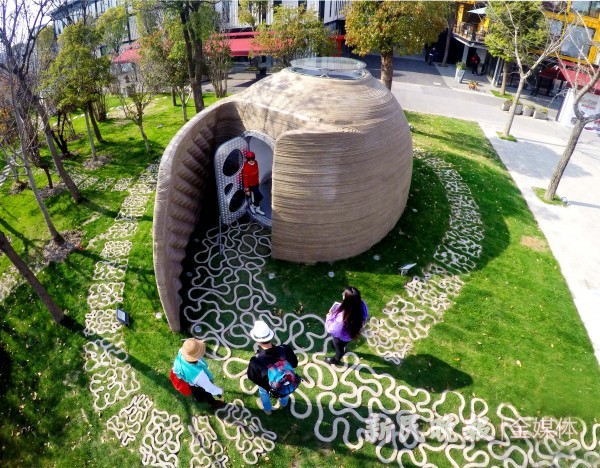 (杨建正 摄影报道)一座鸟瞰形似蓝牙耳机的建筑近日悄然亮相宝山区智慧湾科创园内,这也是上海首座混凝土3D打印书屋。